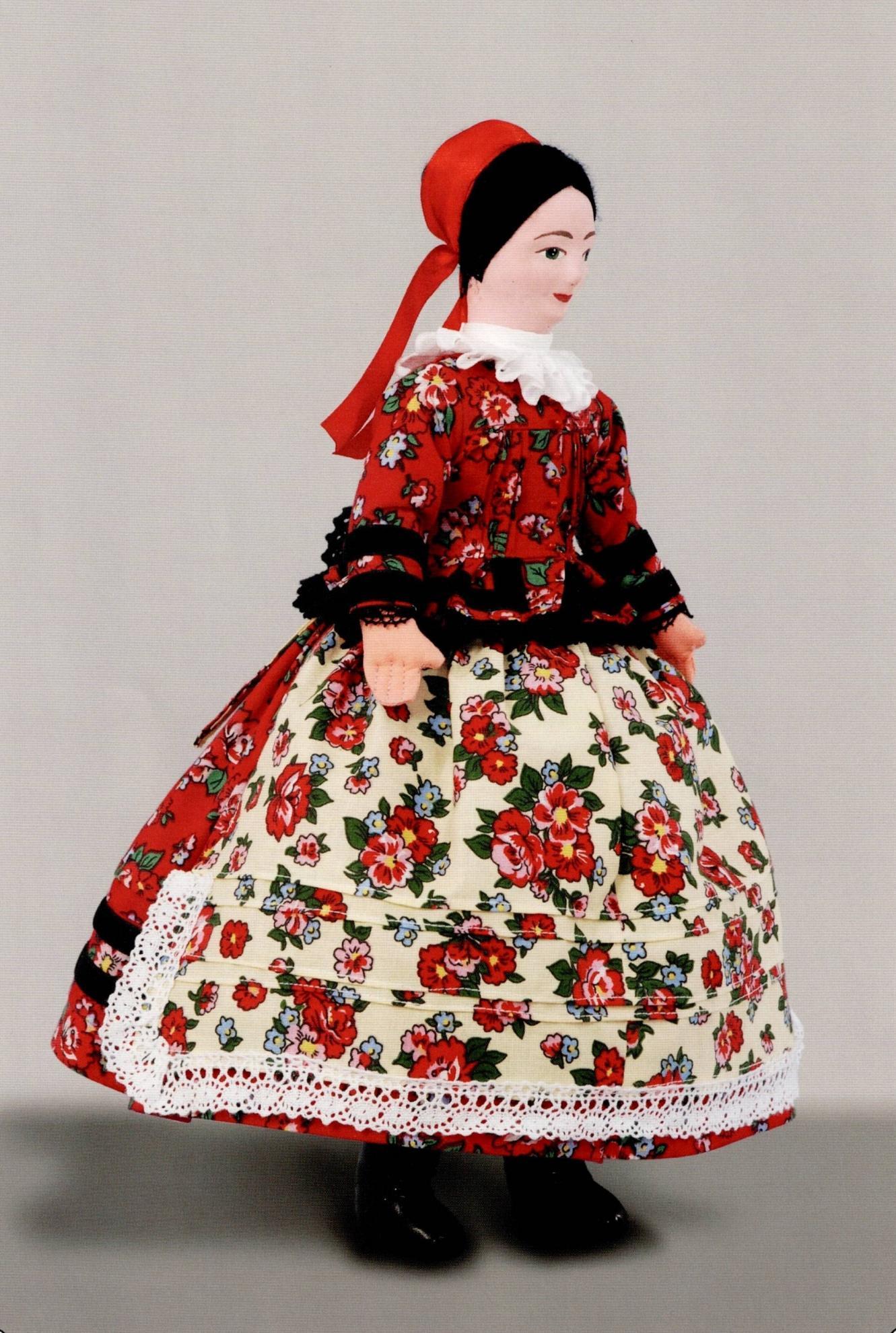 A viselet anyaga eredetileg delin (delén), amit a babán piros „földű” nagyrózsás karton helyettesít. A bőven ráncolt ruhát piros virágos, alján csipkével keretezett kötő fedi. A felsőtesten viselt ráncos ujjast elöl és hátul egyaránt sűrű piék (keskeny levarrások) teszik szorosan testhez állóvá. Az ujjas fodrozódó alsó része kihangsúlyozza a csípő vonalát. A baba nyakán a nagylányok ékessége, a madeirából ráncolt mizli. Két ágba font, koszorúba föltekert, széles piros pántlikával körbekötött haját nagyjányos kontyban viseli.