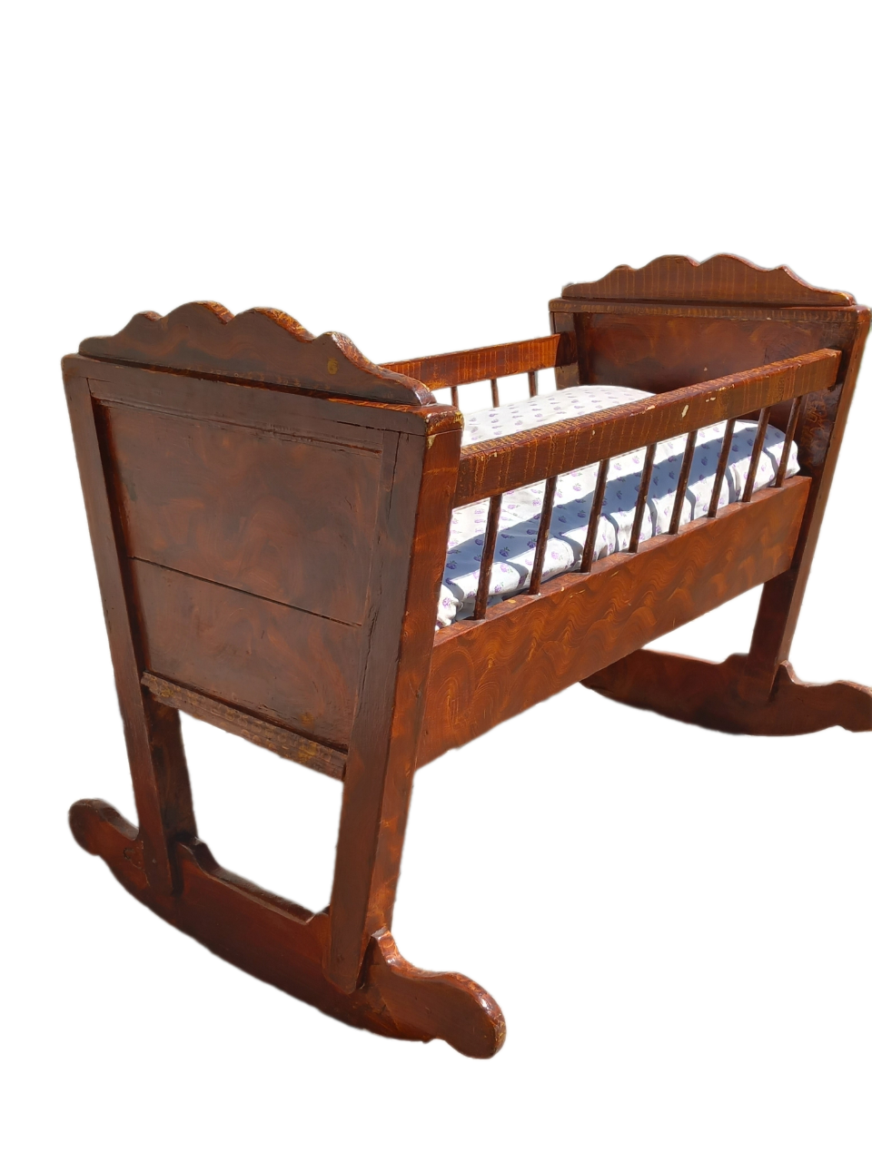 A flóderozott talpas bölcső két támláján felül hullámvonalas fűrészelt díszítés van, hosszanti oldalán vékony rácsozás található. Talpkiképzése jellegzetes, kétoldalt kisé kinyúló, végeik visszahajlóak. A fenékdeszka nincs rögzítve, a bölcsőben legalulra szalmát helyeztek, arra pedig kis vászonlepedő került. (A flóderozás vagy faerezet festés egy régi díszítőfestő mesterség, melynek során a festő speciális szerszámok segítségével a fa erezetét kézzel festi rá a felületre.)