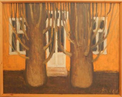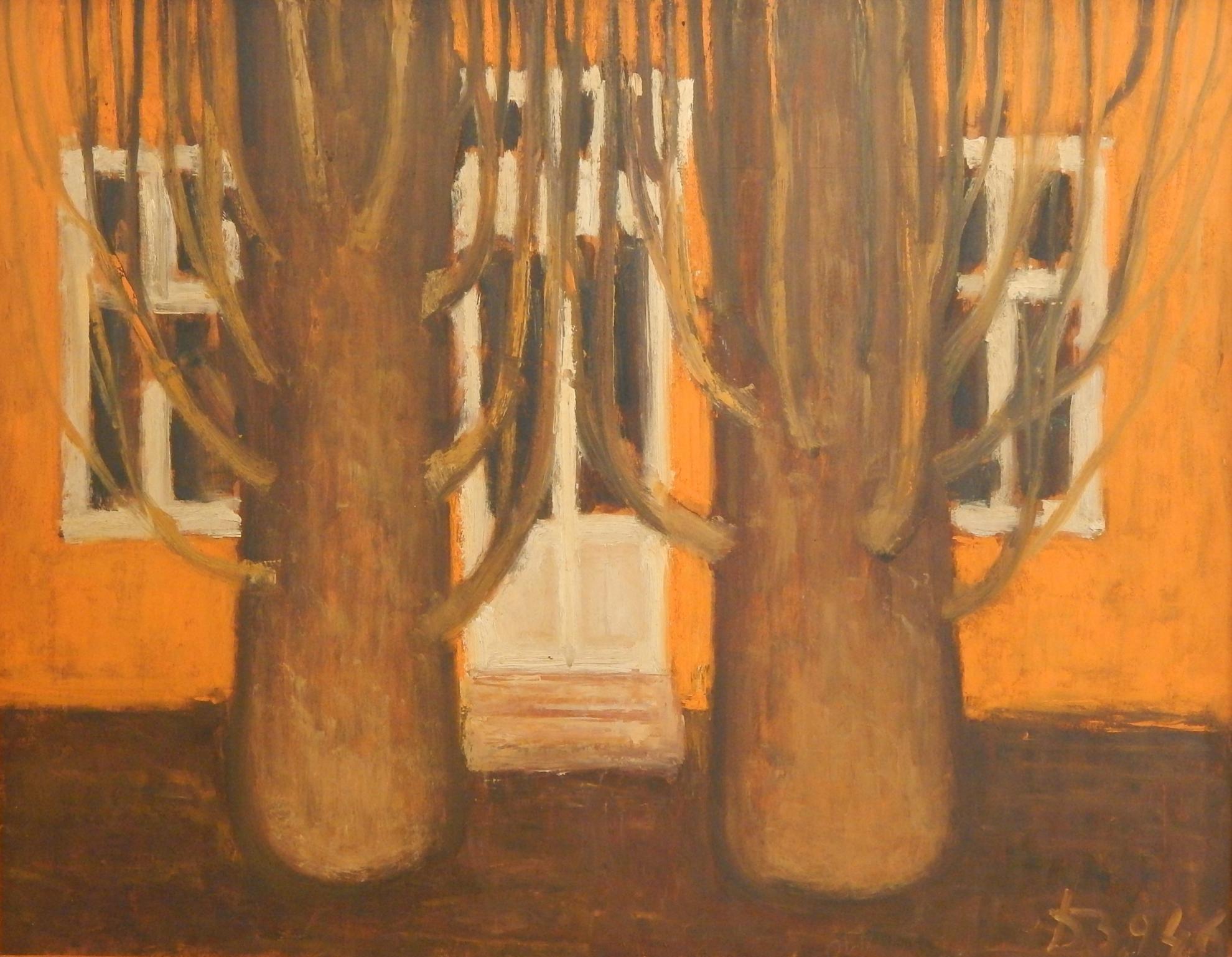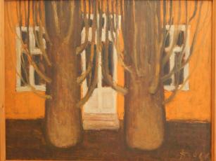A Nyíregyházi utca szűk kivágású kép. Ott sétálunk mi is azon az őszi nyíregyházi utcán, ahol vastag törzsű, levelüket rég levedlett fák alkotnak valamilyenféle allét, és sétánk közben hirtelen megérkezünk valahova. Talán haza, talán épp oda, ahová tartottunk. Hirtelen megállunk, és szembefordulunk azzal a két fával, amely mögött a ház áll, ahová igyekeztünk, egy kisvárosi ház, narancssárgás fallal, fehér ajtó- és ablakkeretekkel. Bent még sötét van, talán nekünk kell ott felkapcsolnunk a villanyt, és ahogy megállunk, a szűk kivágás miatti beszorítottság érzése eltűnik, marad az otthonosságé. Fel akarunk menni az ajtó előtti két lépcsőfokon és meg akarunk érkezni. Szűk kivágás, közelkép, összesen négy szín, egyszerűsítés. Az előtérben lévő két súlyos, mindenfelé tar ágakat meresztő fatörzs már láttat valamit a későbbi küldetéses alkotó sajátos szimbolikájából. Nem precíz, részletgazdag látképet fest, nem az alakok és épületek sokaságával tárja elénk az utcát, a várost, hanem egyetlen közelképpel, egyetlen kivágott részlettel, amelyen a háttérként használt házrészlet és az előtérként használt két fa képes nemcsak érzékeltetni a hely hangulatát, hanem maradéktalanul át is adni azt: a kisvárosét, ahol, ha akarjuk, otthon vagyunk.
