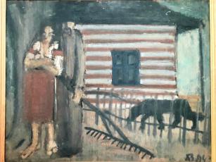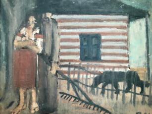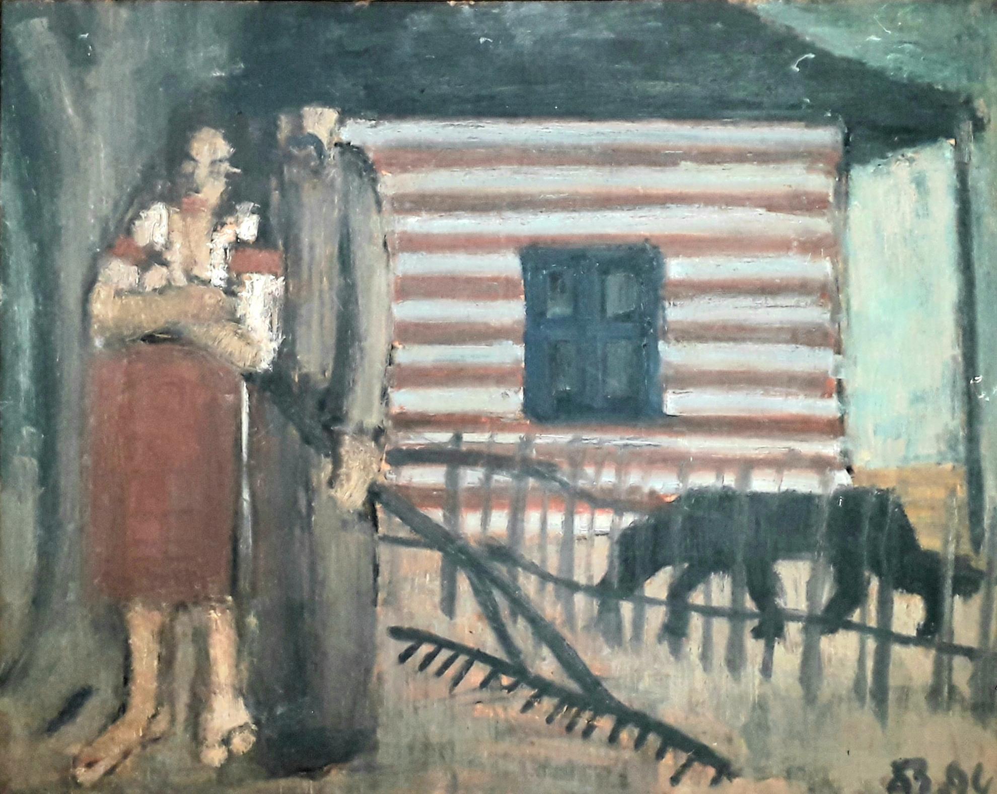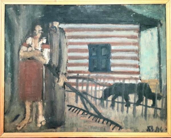 Szűk kivágású közelképen egy ruszin paraszt és felesége állnak az erdőszéli házuk előtt. Diószegi ritkán festett meg együtt paraszt férfiakat és asszonyokat, a Rétközi Múzeumban is ez az egyetlen ilyen alkotása. A kép baloldalát teljesen elfoglalja az emberpár. Az előtérben meghatározó, súlyos figuraként van jelen az karját keresztbe fonó mezítlábas asszony, akit mintha támogatna a féloldalt álló, bajszos, kalapos, behúzott vállú férfi. A támogatás érzését erősíti a férfi kezében levő hatalmas, ritkás fogazatú, szénagyűjtő fagereblye is. A háttérben, a két alaktól kerítéssel elválasztva ott van a csíkos falú ház, előtte egy legelésző fekete lóval. A korai korszak festményéről lévén szó, itt még jelen vannak a színek, a kompozíció, és végsősoron valamilyen harmóniára való törekedés is. A parasztasszony vörös-fehér ruházata a gerendaház vörös-fehér harántcsíkjaiban ismétlődik, a fagereblye ritkás fogazata a kerítés facölöpjeiben folytatódik, míg a fekete tető mintegy ellenpontozza a fekete ablakot és az alatta legelésző fekete állatot, amelyről csak sejtjük, hogy ló. Az egyszerűsítésre való törekvés viszont már megjelenik itt is, hisz ez nem zsánerkép, nem látjuk a főalakok arcát, viszont kiáltóan, szinte torz módon az előtérben vannak a különböző testjegyek, főként a nőalak két hatalmas lába. Diószegi nem egy általa ismert, vagy látott ruszin párt akar itt bemutatni, hanem a ruszin parasztok tipikus képviselőit, már egyszerűsítve, elvonatkoztatva. Mindaz, ami körülveszi őket, a ház, a kerítés, az udvar, a legelésző állat mintha csak egy mögéjük rakott díszlet, majdnem perspektíva nélküli háttér lenne. Síkminta, ami csak arra jó, hogy aláhúzza, kihangsúlyozza a lényeget: az elöl álló emberpárt, a zárt, súlyos paraszti világ tipikus képviselőit.