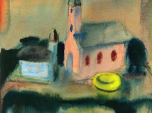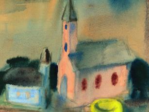 Ennek az 1948-as esztendőnek, amikor még ki kellett tartani, ennek a terméke ez a templomokat ábrázoló akvarell, amely minden bizonnyal egy technika bemutatása, egy ujjgyakorlat volt, a korrigáló tanár alkotása. Szinte látjuk magunk előtt, ahogy a mester vízbe mártja a papírt, majd széles, gyors ecsetvonásokkal ráviszi alul a két sor sötét és két sor világoskéket, a festék megfolyik, de épp csak annyira amennyire kell ahhoz, hogy egy magaslat hatását keltse, a sötétkékből kerül a kép közepére is kétoldalt, majd egy kevés fentre, de itt már valamivel halványabban, az eget szimbolizálva. Az égen bal felől, mintegy ellenpontozva a sok kéket, egy pirosas csík húzza meg magát. A kép közepét két templom uralja, két egymással furcsán szembenéző templom, egy magas halványpiros falú, három barna ablakkal, és egy kis halványkék, melyre fentről néz a nagy, és melynek meleg színei mintegy ellenpontozzák a sok kéket, fókuszba gyűjtve a fényeket. A fókusz élezésének kedvéért a nagyobbik templom oldalában egy rikító sárga paca van, talán virággrupp. A két templom megfestésekor a mester hagyta már egy kicsit száradni a papírt, mert élesebb vonalakra, tisztább kontúrokra volt szüksége. Ha eltávolodunk egy kicsit a képtől, akkor két templomot látunk egy domboldalon, a körülöttük villódzó kékek néha kicsit türkiznek is tűnnek a mélyükön egy kis zölddel, és érezzük, hogy bármennyi idő alatt, bárkiknek is készült ez a kis akvarell, azokban a templomokban lakik valaki.