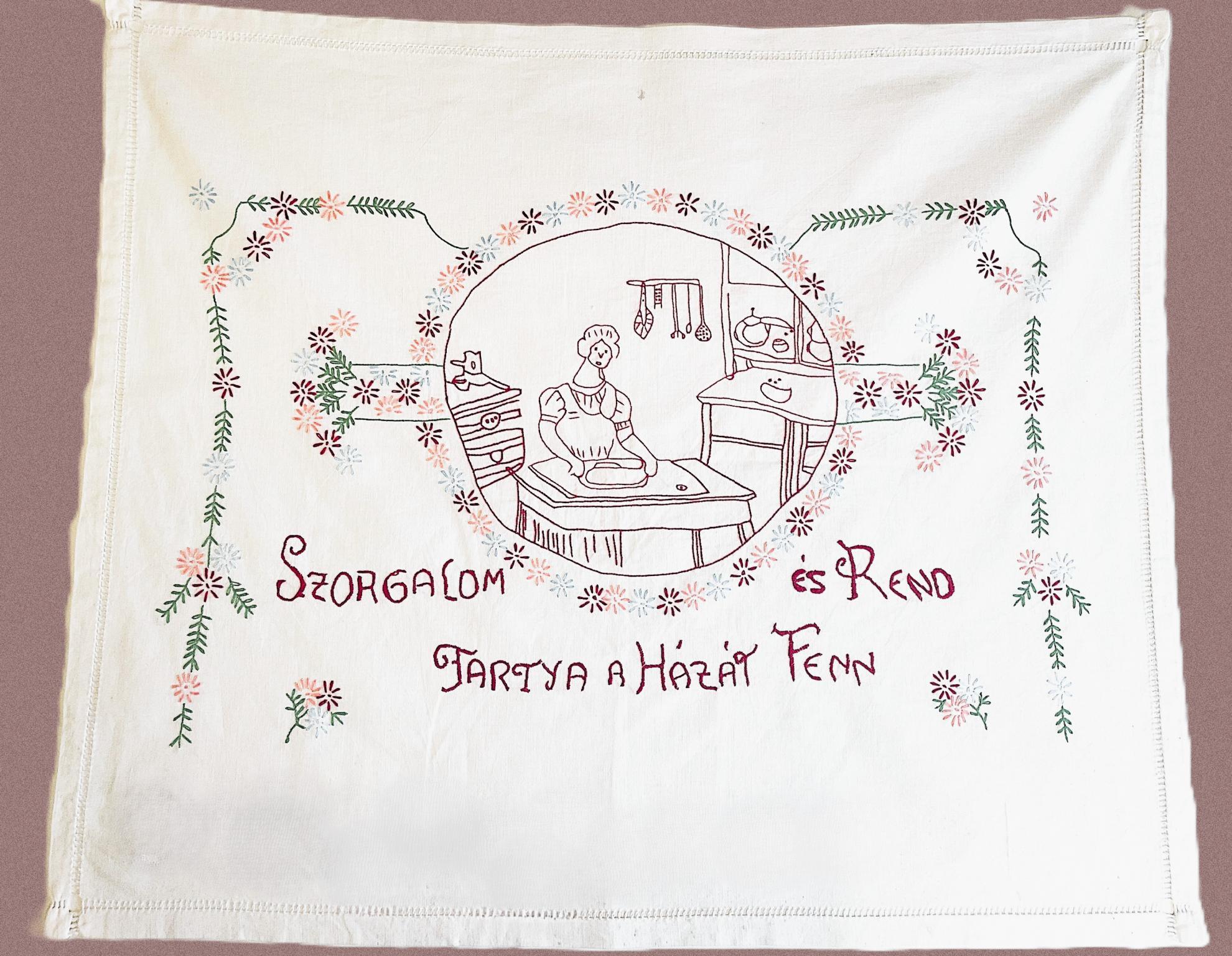 A Rétközi Múzeum gyűjteményében lévő feliratos falvédőt Richter Ibolya anarcsi lakos ajándékozta – családi hagyatéka részeként, számos más kézimunkával, szőttessel együtt – a Rétközi Múzeumnak. Ibolya néni édesanyja, Szabó Magdolna a romániai Máramaros megyében született, ahonnan Nagybányára költözött és ott is élt élete végéig. A varrottasok és szőttesek az ő, illetve édesanyja, Makovszki Mária munkái. Richter Ibolya 1990-ben költözött át Kisvárdára, majd Anarcsra, így került a hagyaték a mi gyűjtőkörünkbe. A hagyatékot Csalló Klára, a Kisvárdai Jótékony Nőegylet tagja ajánlotta a Rétközi Múzeum figyelmébe.