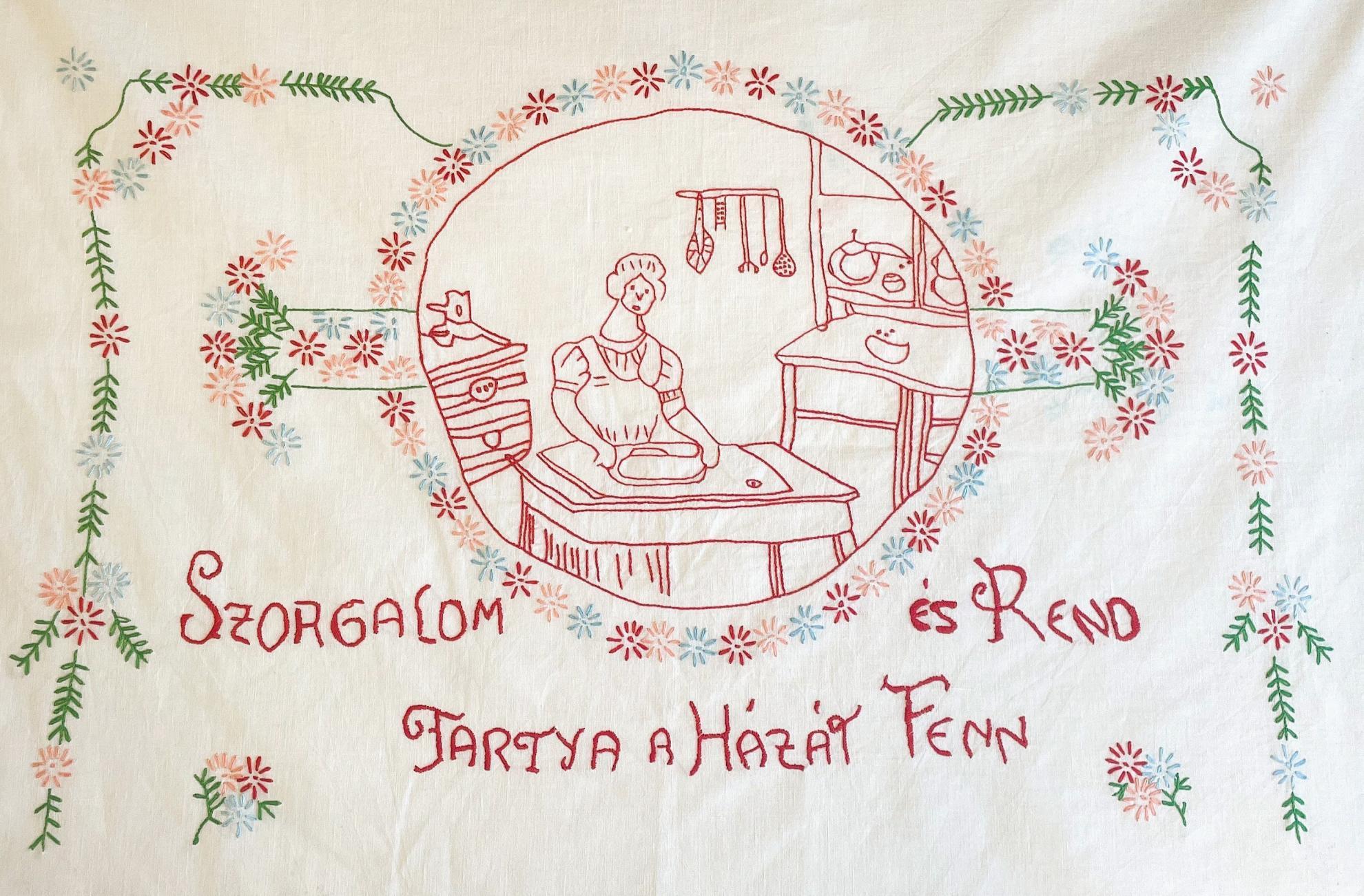 A falvédő piros, kék és rózsaszín cérnával, szálöltéssel varrt virágok közötti körben egy konyhát jelenít meg, melyben az asztal előtt egy lány vagy asszony tésztát gyúr. A falvédő alsó részén piros színű kivarrt felirat látható, melynek szövege: „Szorgalom és Rend Tartya a Házát Fenn”.