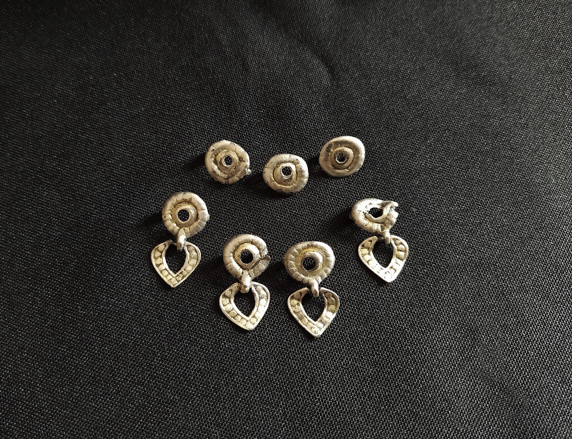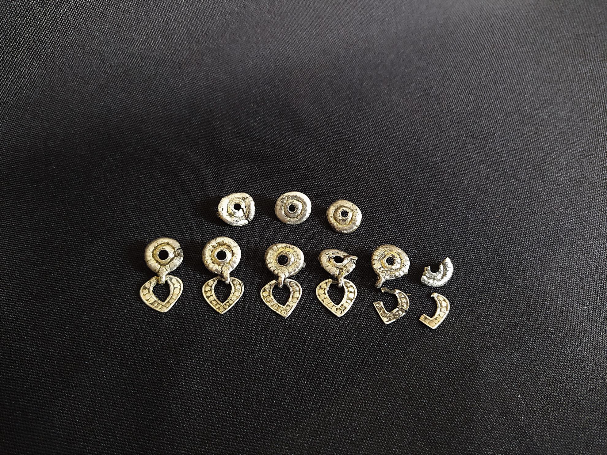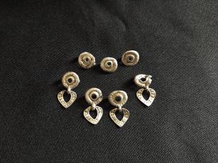 A kerek alakú veretek mérete: 1,20 x 1,30 cm, a kéttagú veretek mérete: kerek alakú rész 1,5 x 1,3 cm, szív alakú rész: 1,3 x 1,9 cm.
