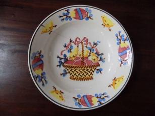 Tányérunk öblében a locsolkodások alkalmával jutalmul kapott színes tojások tárolására szolgáló, barna, karos kiskosár látható, benne piros (bordó) hímestojásokkal, és a kosár karjának felső részére bokrétába kötött színes szalaggal. Ami szokatlan ezen a tányéron, az a sárga kiscsibék szerepeltetése a kompozícióban. Ez még kedvesebbé, és egyben egyértelműbbé is teszi a tányér ünnepi jellegét, amit még a kosárból kilógó kék barkák is erősítenek. A peremen az öböl kompozíciója még hangsúlyosabban jelentkezik: sárga kiscsibék futnak a kék szalaggal átkötött, barkaággal díszített hímes tojások után.