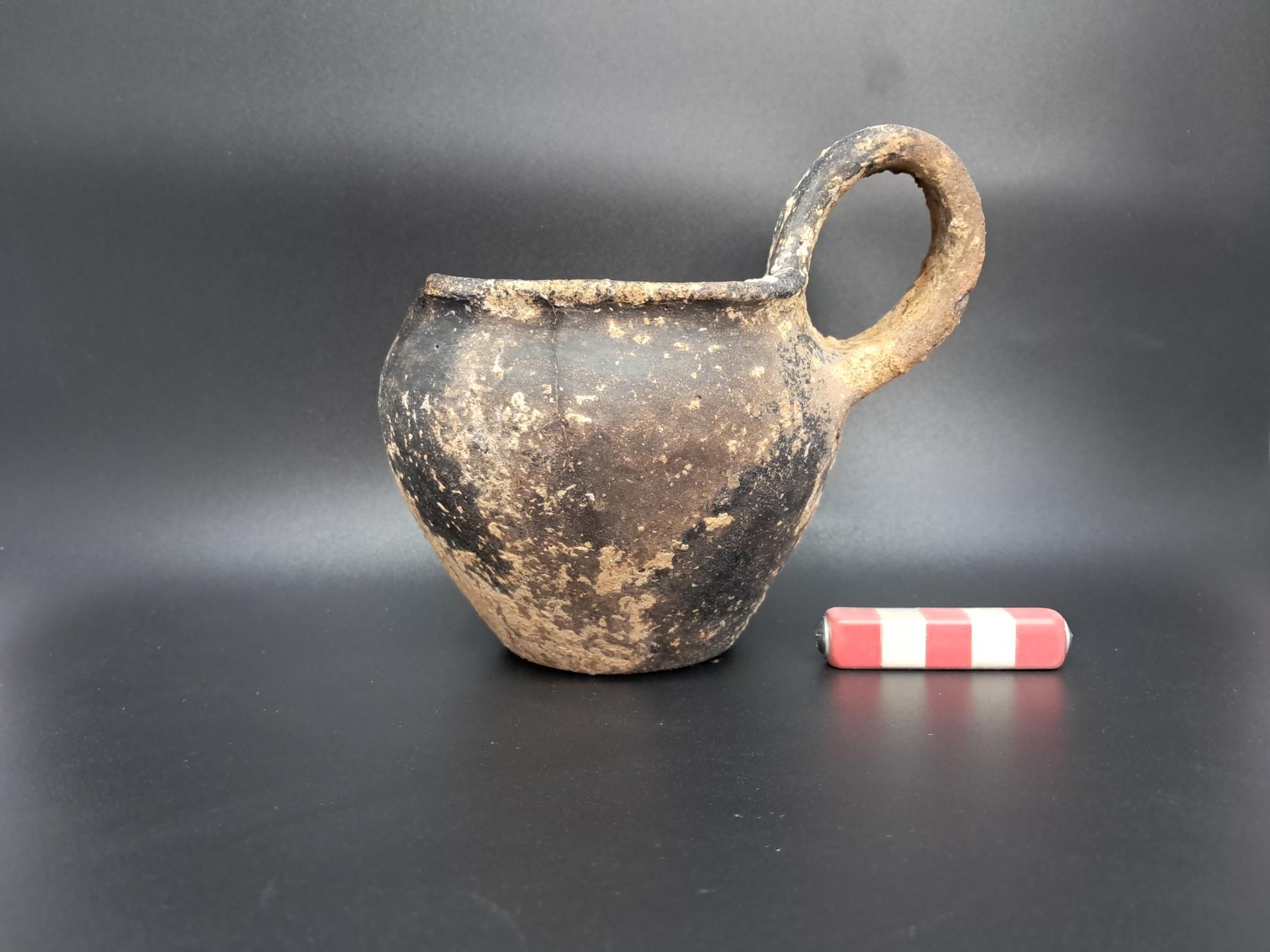 A bögre, oldalára billenve egy sekély gödör alján feküdt. Pereme kihajló, teste kissé gömbös, egyetlen füle a peremből indul és magasan a perem fölé van húzva. Színe eredetileg fekete, barna foltos, felületére földes szennyeződés cementálódott, ami a restaurálás során fog eltávolításra kerülni. Az edény a késő bronzkori Gáva-kultúra időszakához köthető (Kr.e. 1400/1300 – 900/800). Magassága 8,75 cm, füllel együtt 12,6 cm, szájátmérő: 9,3 cm, aljátmérő: 6 cm.