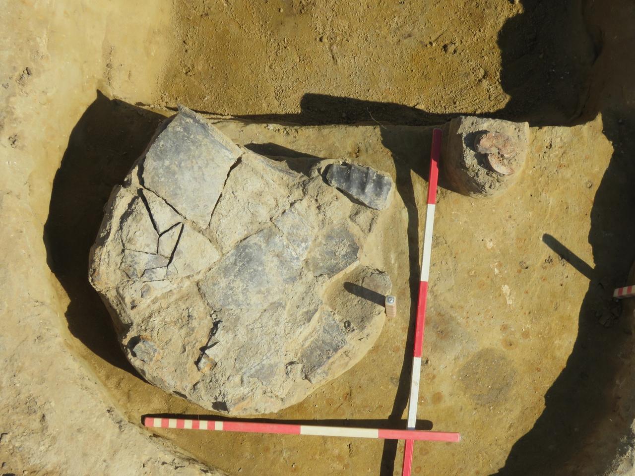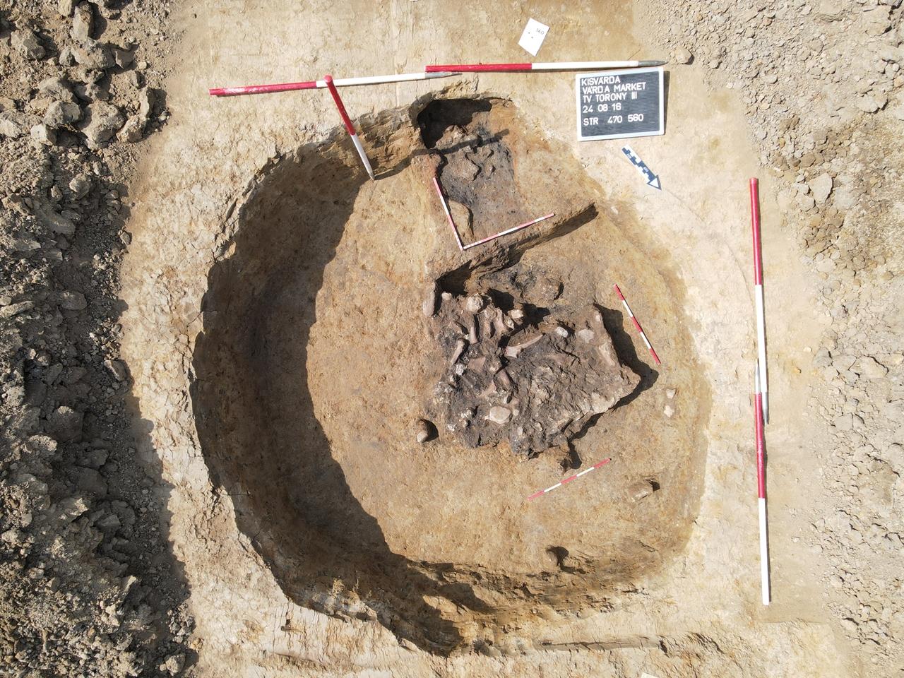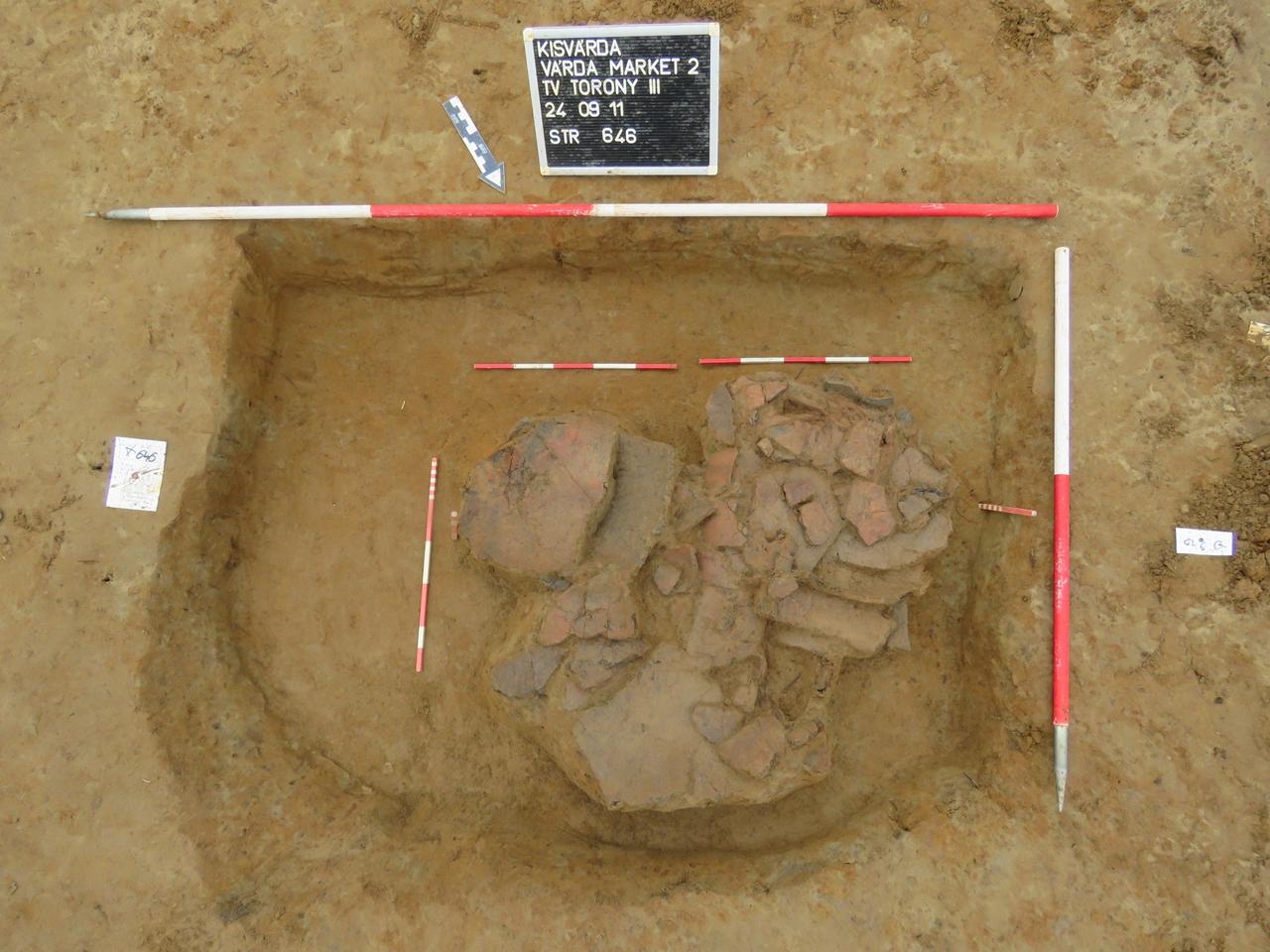 A késő bronzkori településrészlet kisebb méretű, kerek gödrökből állt, amelyek a bemutatott füles bögréhez hasonló szép és egész edényeket rejtettek. Jellemzően az ép edények magányosan vagy nagyon kevés egyéb lelettel együtt kerültek a gödrökbe, azonban feltártunk olyan jelenségeket is, amelyek több edény darabjait rejtették és szándékosan helyezték el együtt őket. Ez utóbbiakat a bronzkincsekhez hasonló depókként értelmezi a kutatás.