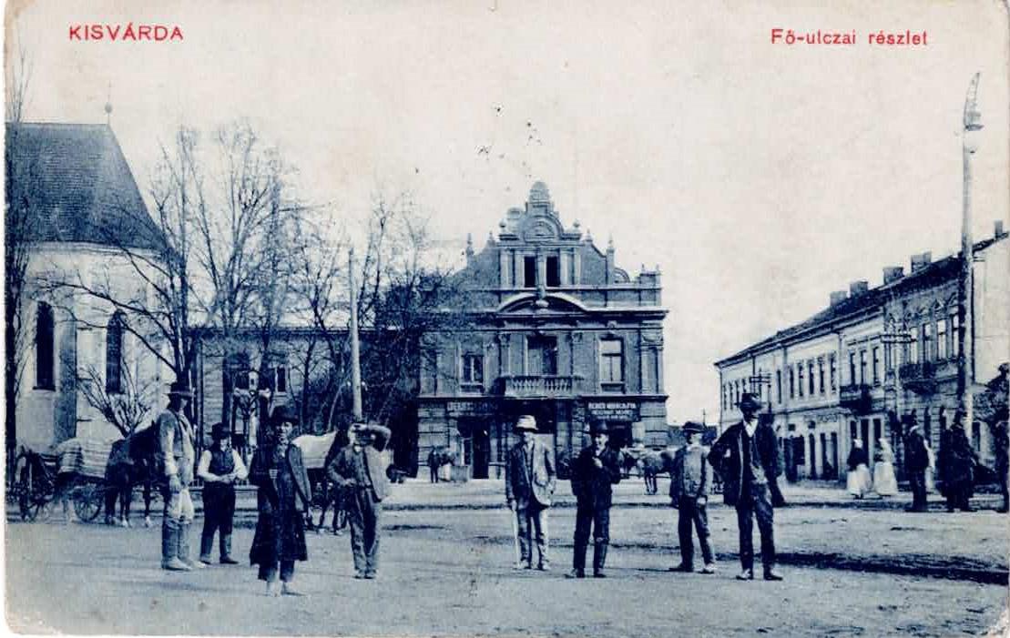 A kép középpontjában a Kisvárdai Ipar és Kereskedelmi Bank áll. Az épület a 19. század közepén magánházként szolgált, a Kaszinó Egylet is működött benne, majd 1886-ban a frissen alakult bank tulajdonába ment át. A banki funkciót máig jelzi a homlokzaton lévő méhkas. Ettől kezdve az építményt csak Iparbankként, vagy vezérigazgatója, Diner Gyula után Diner-bankként emlegették, noha a pénzintézet csak bizonyos helyiségeket használt. A létesítmény déli- és keleti oldalában, mely a korabeli piac felé nézett, üzletek, boltok ablakai, kirakatai, portékái csábították a vásárlókat, mint ahogy ezen a lapon is olvasható: Bencs Mihály és Fia mészáros és hentes, illetve Eperjessy. 1893-ban a tulajdonosok a kisvárdai Szénási János építészmester tervei alapján bővítették az épületet, mely így eklektikus stílust kapott. A földszinti üzletek továbbra is kínálták árucikkeiket. A bank az 1948-as államosításáig betöltötte hivatását. A szocializmus éveiben többféle módon hasznosították az ingatlant, 1990-től a városi könyvtár szolgálja benne a közösséget