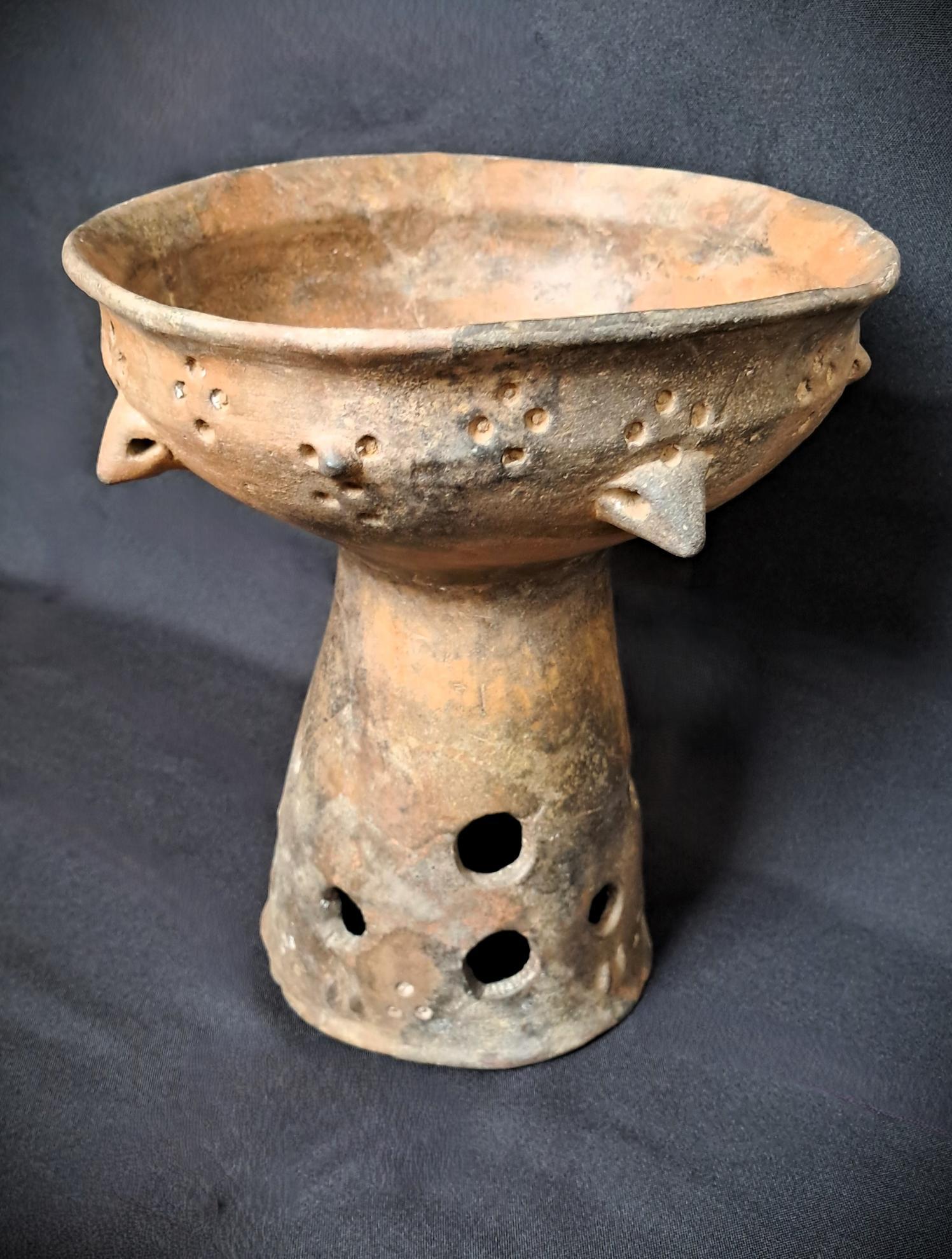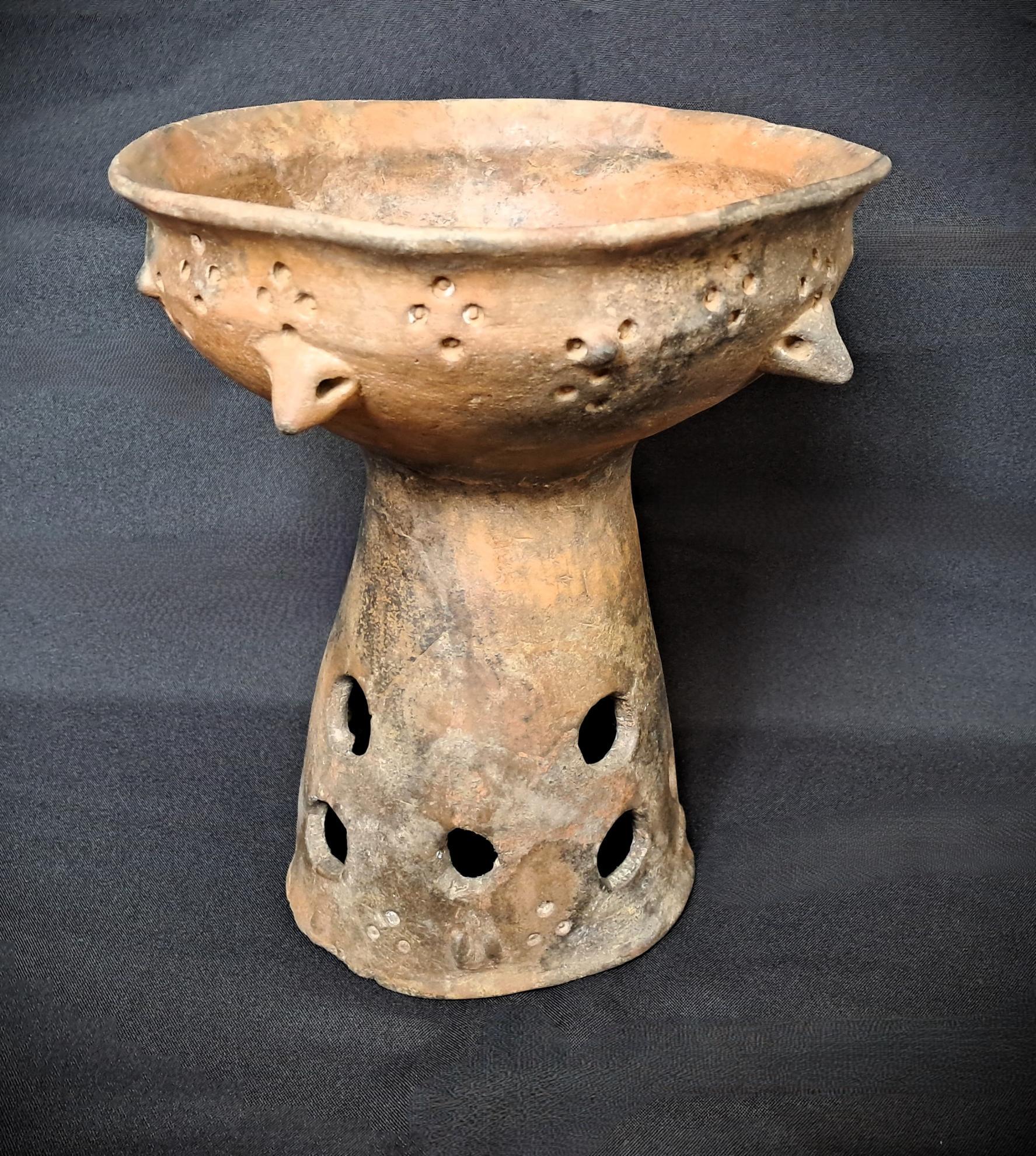 A sírban az elhunyt bal medencéjénél feltárt edény a korszakra igen jellemző, kézzel formált csőtalpas tál. Felső részét öt nagyobb méretű, hegyes, átfúrt bütyökkel és négy kisebb méretű, ugyancsak átfúrt bütyökkel ékesítették. A bütykök közötti felületet négyszeres benyomkodott pontmintával töltötték ki. Talprésze magas és szintén gazdagon díszített, felületén tizenkét áttört lyuk látható, alatta apró bütykökkel és háromszoros benyomkodott pontmintával kiegészítve.