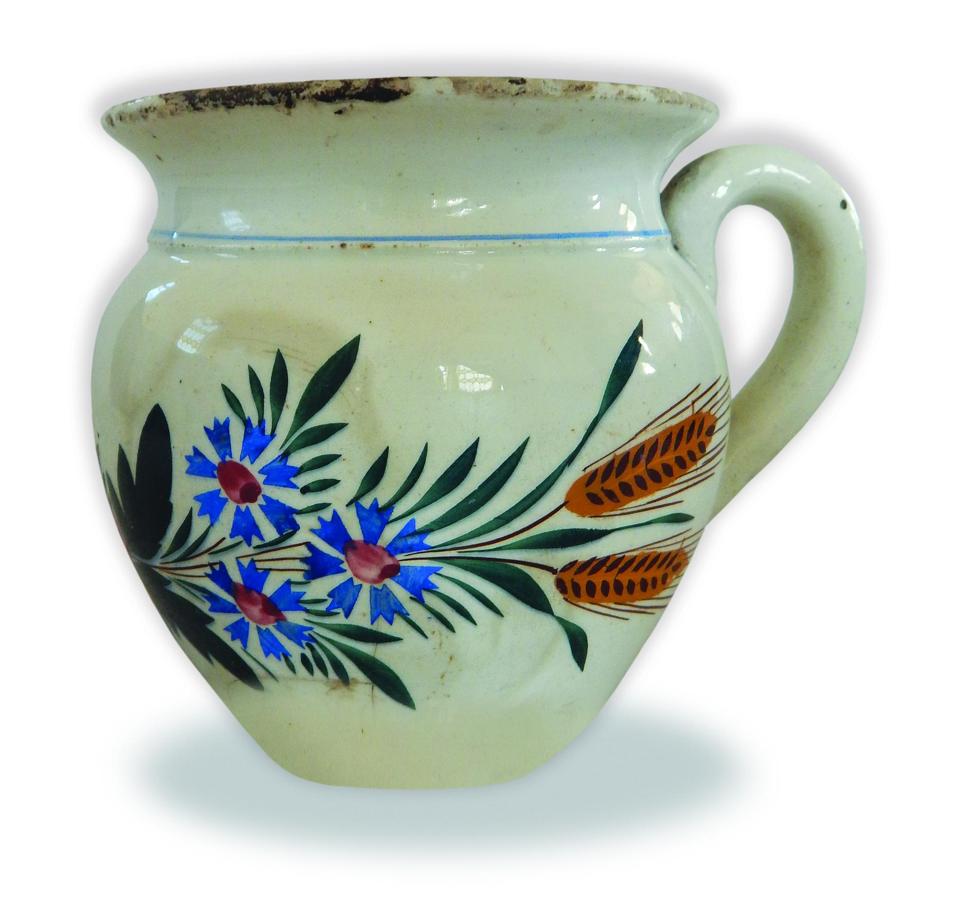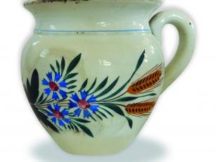 Ebbe a kategóriába tartozik a Rétközi Múzeum tejfeles keménycserép bögréje, amely az oldalán található kézzel festett minta alapján is megérdemli a figyelmet. A rajta szereplő női név azt mutatja, hogy szerelmi ajándék lehetett. Kiöblösödő hasára virágábrázolásként egy rózsát festettek, amelyet mindkét oldalon, szimmetrikusan elhelyezve, kék búzavirágcsokor és két-két gabonakalász egészít ki. A rózsa fölött, az edény füllel szemközti oldalán a „Róza.” felirat látható. Kihajló szájpereme alatt vékony kék csík fut körbe. A leltárkönyv szerint feltehetően Miskolcon készült a 19. század vége táján, de mivel nincs rajta márkajelzés, ehhez a gyártási helyhez való kötése bizonytalan. Ha mégis mélyebben elmerülünk az edényen szereplő motívumok vizsgálatában, érdekes párhuzamra lelhetünk: nemrég került látókörünkbe egy nagyobb méretű, Apátfalván – Nagy György és fiai bérleményének idejéből – egy 1893–1905 között gyártott festett kancsó, melynek oldalán ugyanezek a minták követik egymást, ugyanígy festve, ugyanazon kéz mestermunkájaként. Így hát kijavíthatjuk a korábbi leltározó által bizonyára a bögre eladójától hallott információ alapján beírt miskolci származási hely adatát – az 1906-tól már Bélapátfalvának nevezett településnévre.